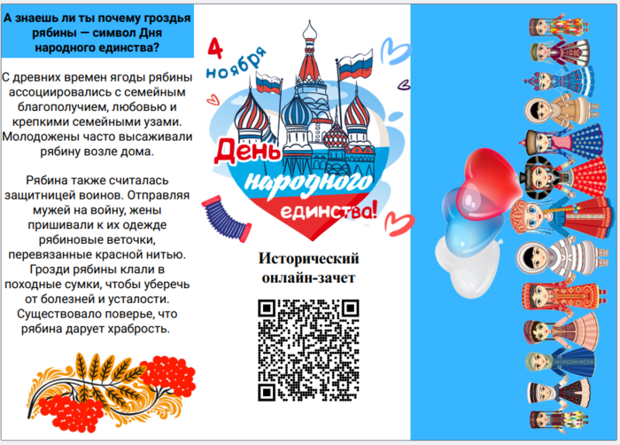 Особое внимание обучающиеся обратили на необходимость сохранения представлений об исторических истоках данного праздника. Совместно с преподавателем истории Гришкиной Д.А. они разработали исторический онлайн-зачет, который может пройти каждый студент колледжа, а также буклет и видеоролик. Социальная акция позволяет не только напомнить о традициях нашей Родины, но и провести исследование ценностных установок современной молодежи.