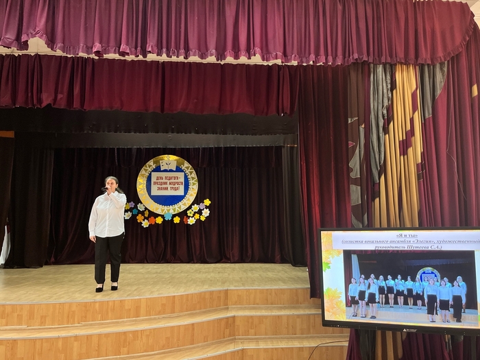 Со сцены прозвучали музыкальные композиции в исполнении вокальных ансамблей «Элегия» и «Мелодия души». Хореографический ансамбль «Престиж» подарил всем собравшимся прекрасные танцевальные номера, а театральный коллектив «Вдохновение» – творческую зарисовку-поздравление с Днем Учителя.